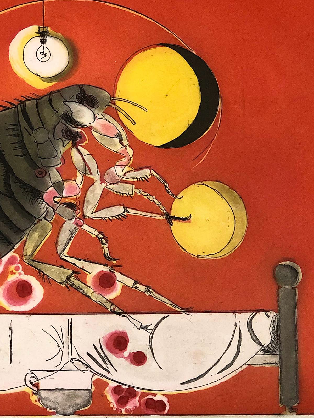 Questa intensa acquaforte e acquatinta di Graham Vivian Sutherland offre una visione surreale, quasi perturbante, resa attraverso il suo tipico equilibrio tra precisione formale e tensione poetica. Su uno sfondo rosso acceso, la figura ingigantita dell’insetto—simbolica e metamorfica—richiama l’interesse di Sutherland per le energie nascoste e spesso inquietanti della natura. La composizione unisce delicatezza e tensione, invitando lo spettatore in un mondo in cui l’organico diventa metafora.